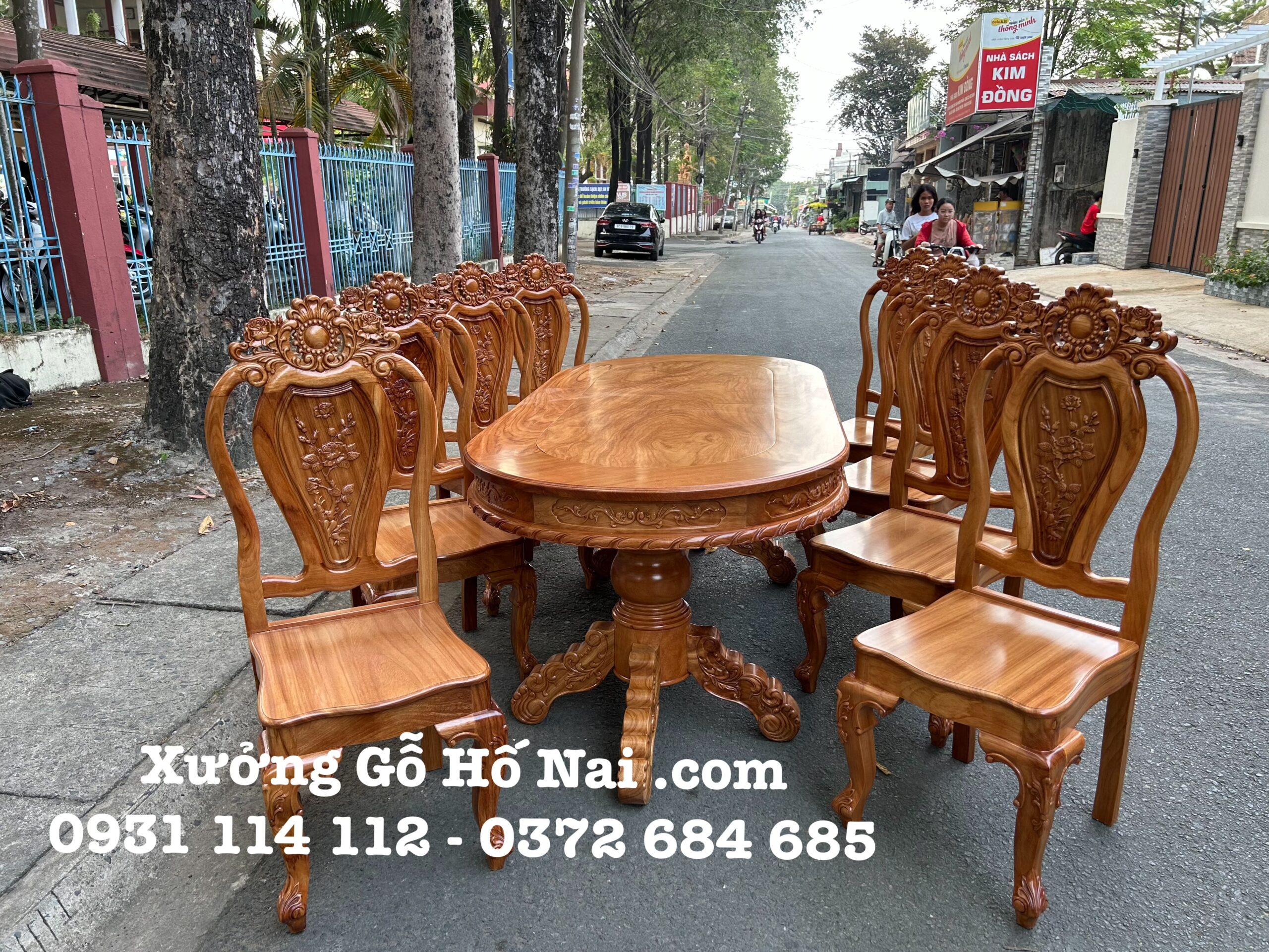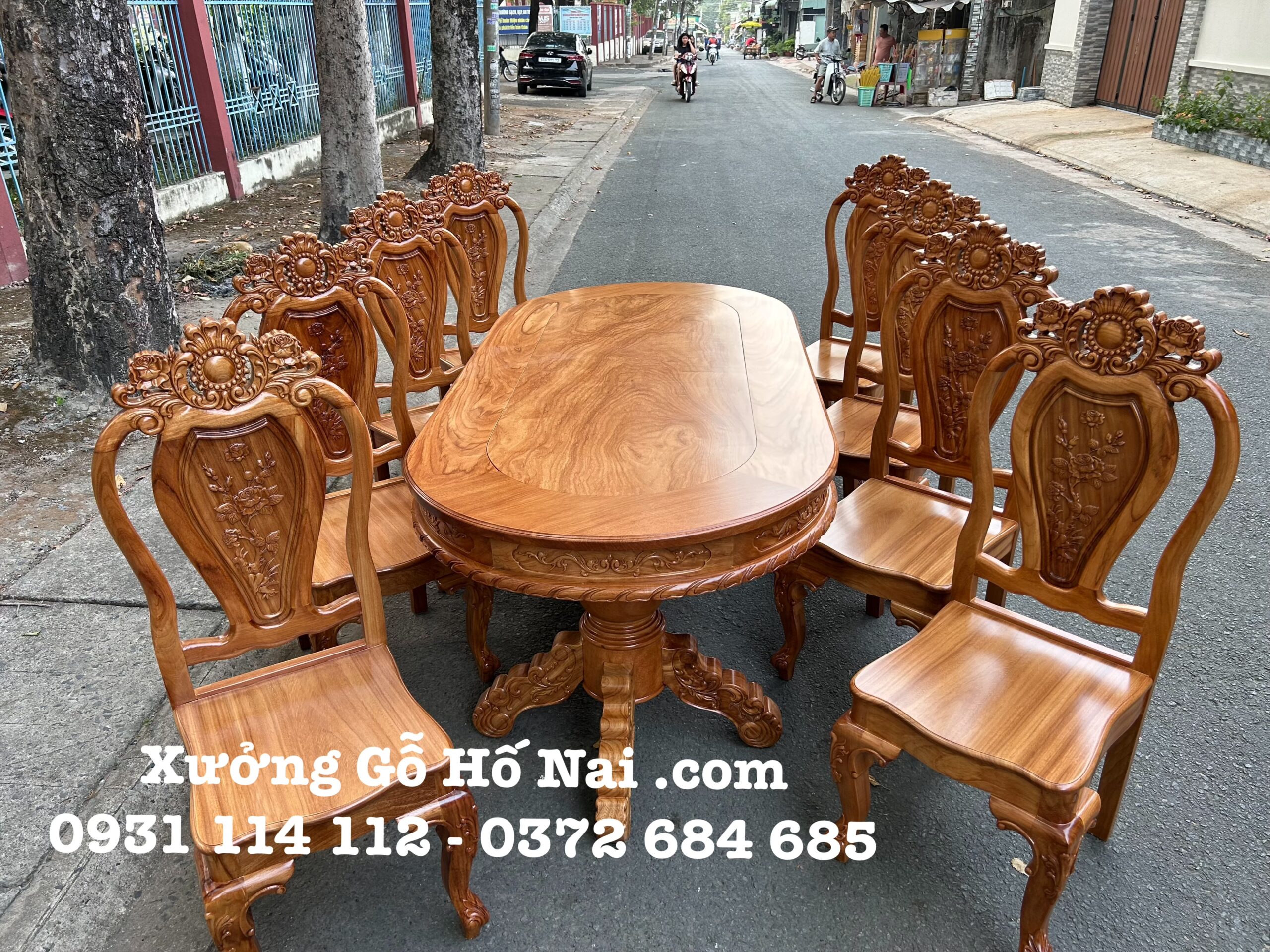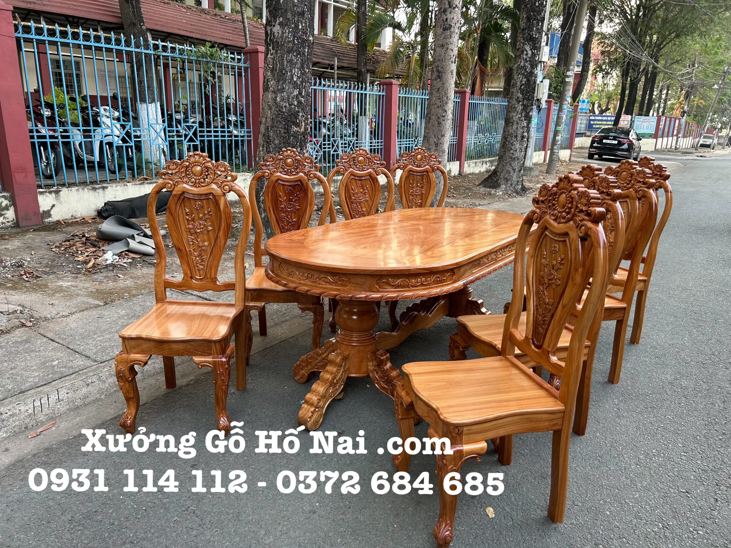 Bàn ăn Gõ oval 8 ghế mặt dày 18B04