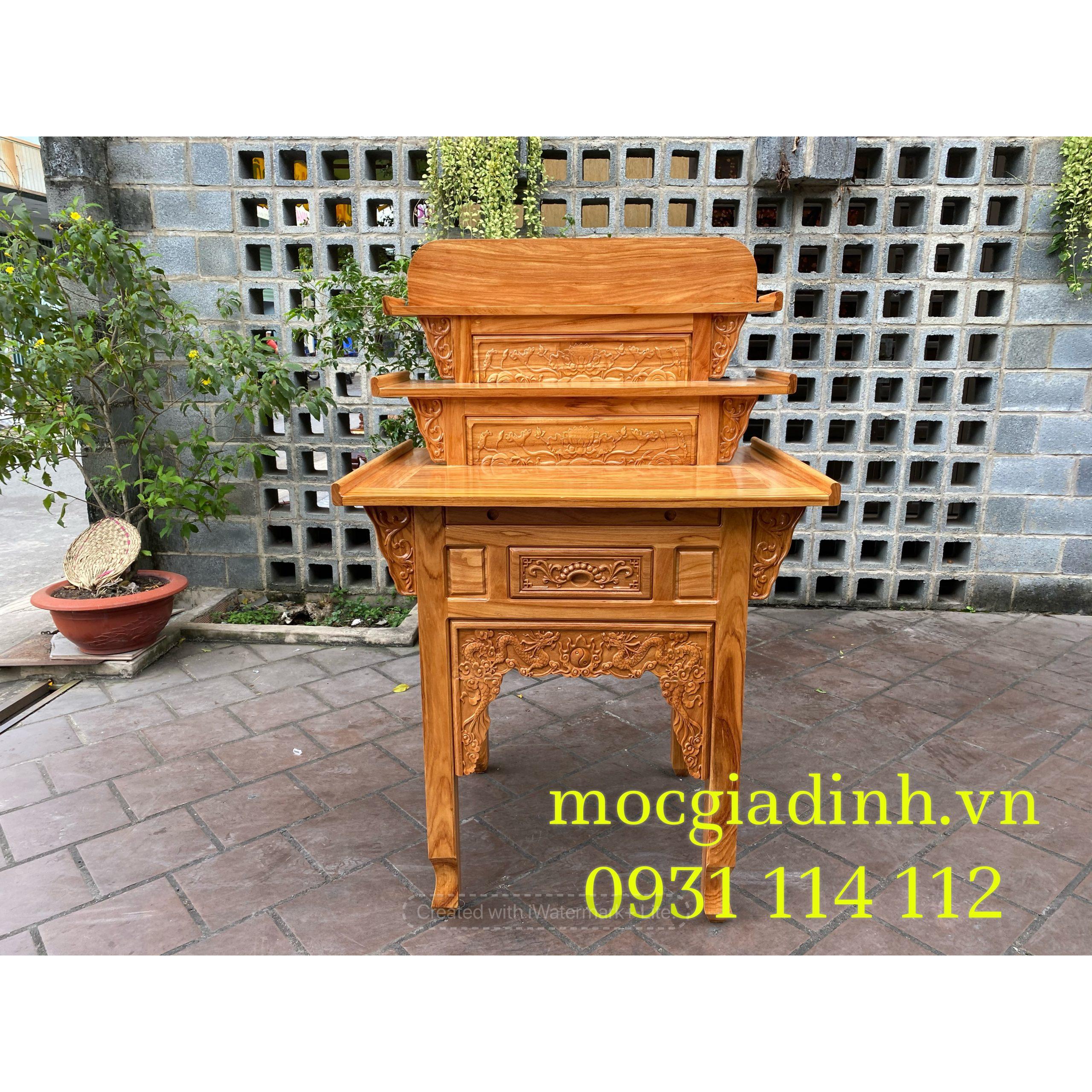 - Bàn Thờ Gia Tiên được làm bằng gỗ Gõ Đỏ 100%, bàn có 3 tầng để thờ nhiều cấp, dưới có thiết kế mâm cúng và hộc để nhang đèn.