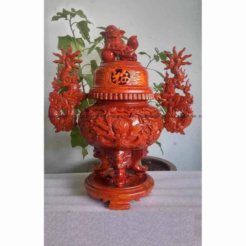 Bộ lư hương được làm hoàn toàn bằng gỗ hương. Lư hương được chạm khắc song long chầu nguyệt hoặc trơn