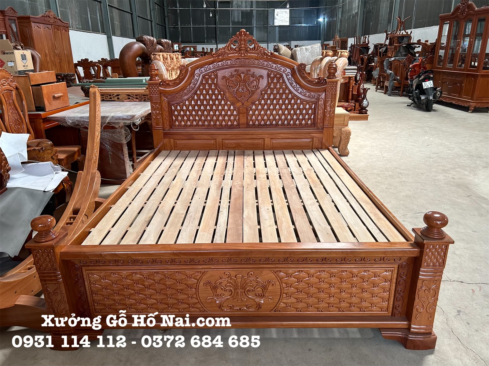 Giường ngủ được làm bằng gỗ Gõ Đỏ toàn bộ, thang dạt bằng gỗ Bằng Lăng (Thao Lao). Đầu đuôi được thiết kế kiểu hoàng gia, viền mặt tựa dày 2,5cm, đục hoa mai cnc nổi dáng hoàng gia. Vai rộng 25cm- dày 3cm cưa đi. Trụ chân 10cm, dày 7cm