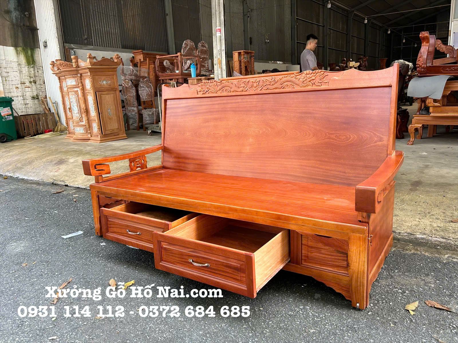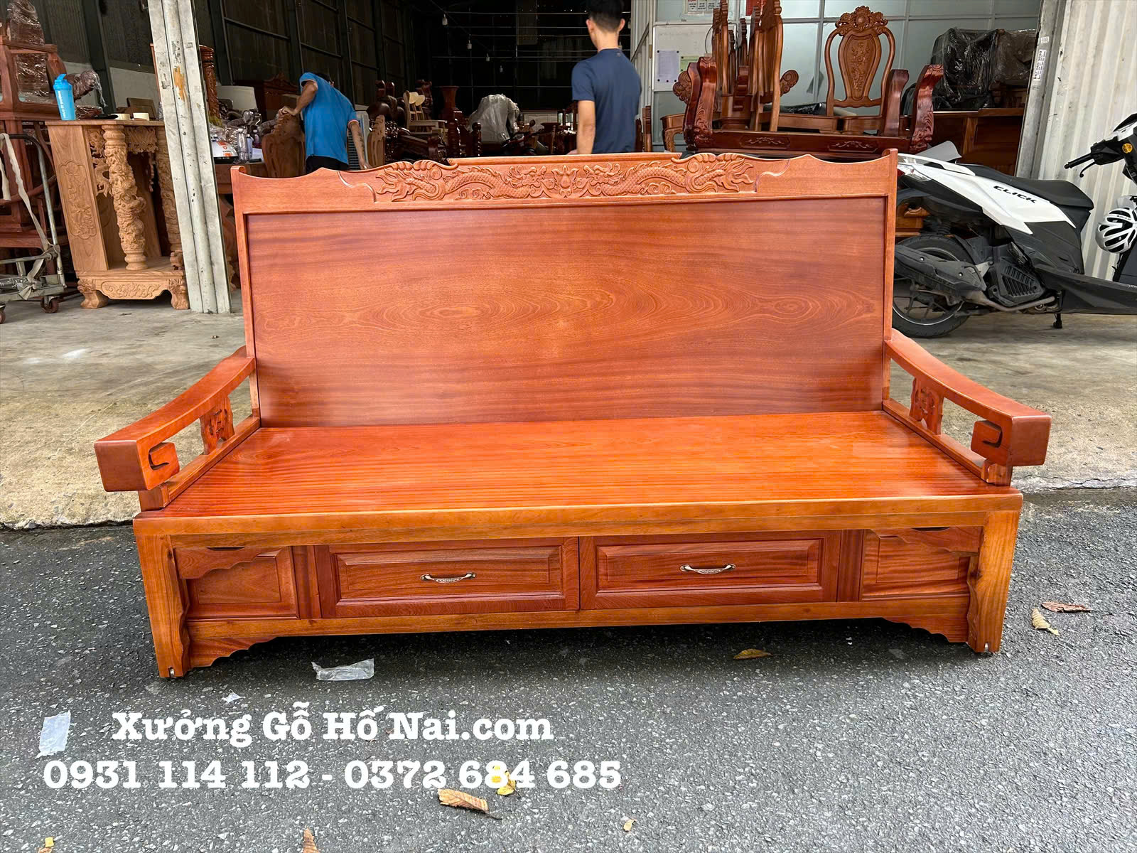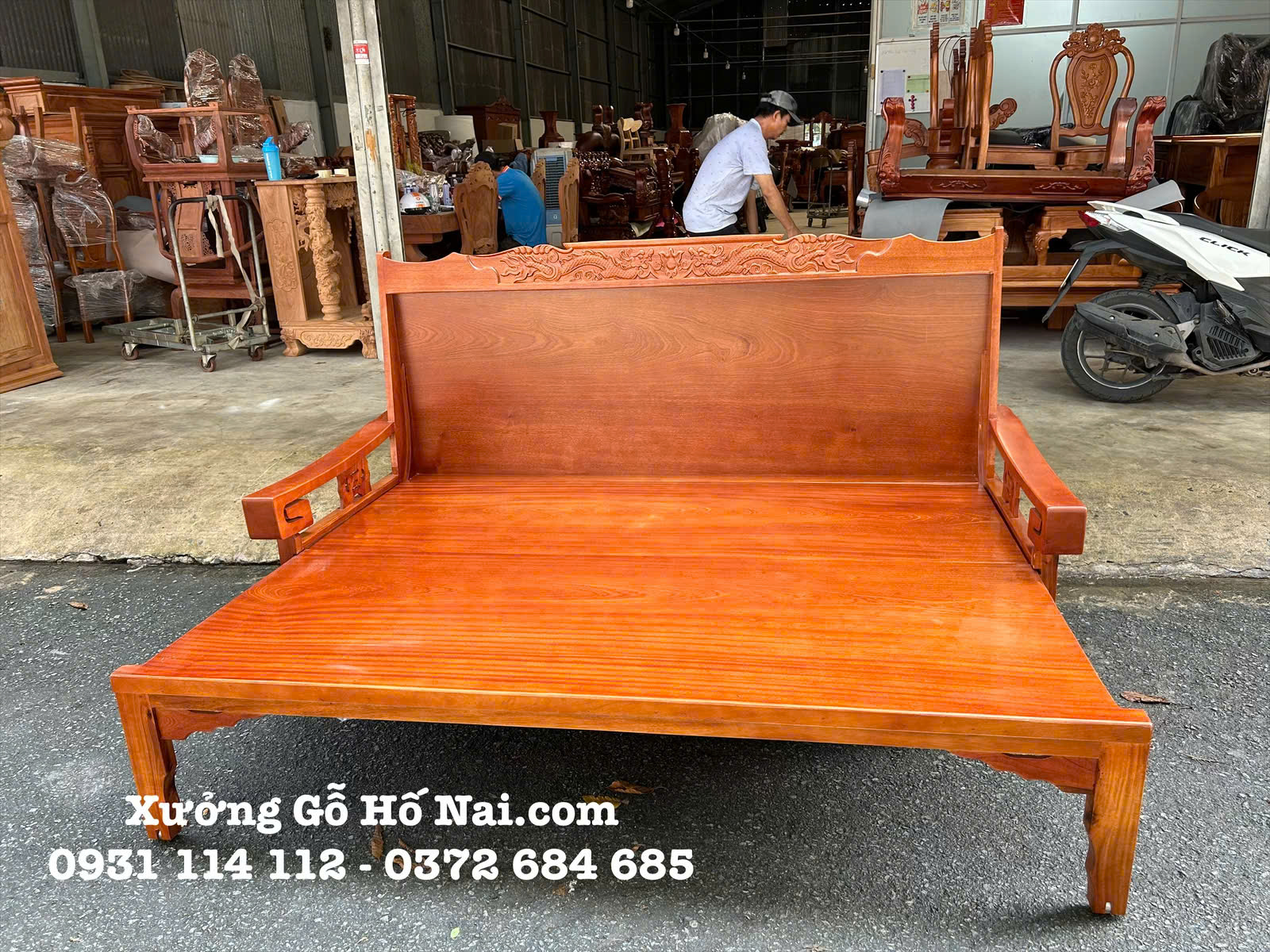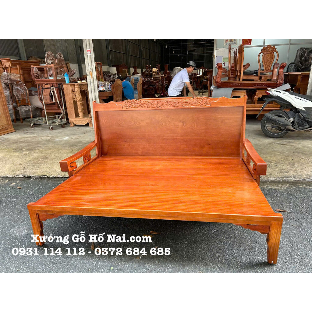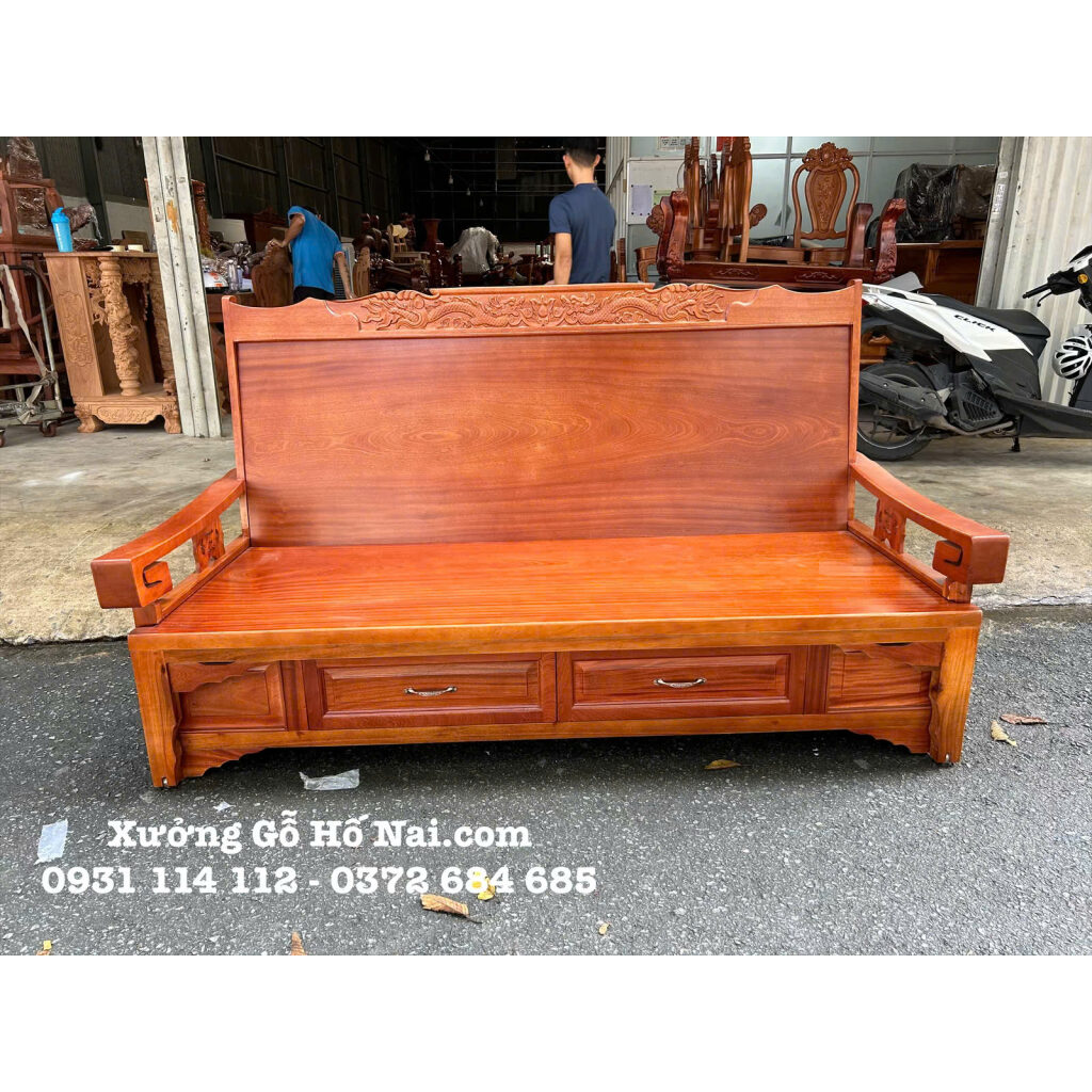 - Trường kỉ được làm từ gỗ Xoan. Mẫu ghế có thể ngồi để xem tivi hoặc tiếp khách, thiết kế có thể kéo ra thành giường để nằm nghỉ ngơi rất tiện dụng.